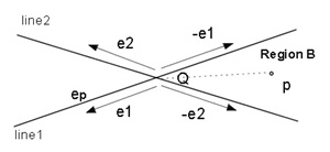 2.2 Formulasreturns=>page top 2.2.1 Formulas for Step1 (Figure 2.3(a)-(e)) To test that the all or part of the bounding box exists in the sandwiched area (light blue area in Figure 2.1), it is enough to test whether each of the vertexes of the bounding box is exist in the sandwiched area or not. The following (a)-(d) describes the case that line1 and line2 are not parallel, and the (e) describes the case that they are parallel. Let e1 and e2 be the unit normal vectors of the line1 and line2 directions, and let ep be the unit vector headed from the point Q to the point p shown as Figure 2.3(a). Here the point Q is the intersection point between the line1 and line2. We find the condition that the point p exists in the "Region A". The the outer product between two 2D vectors can be defined in the similar way of that of 3D vectors as follows; e1×e2 =e1x * e2y - e1y * e2x(1) Here, the e1×e2 corresponds to z-value of the outer product between two 3D vectors and the e1×e2 represents the signed area of the parallelogram spanned by e1 and e2. Additionally we assume e1×e2≧0 (if not, exchanges e1 and e2). :