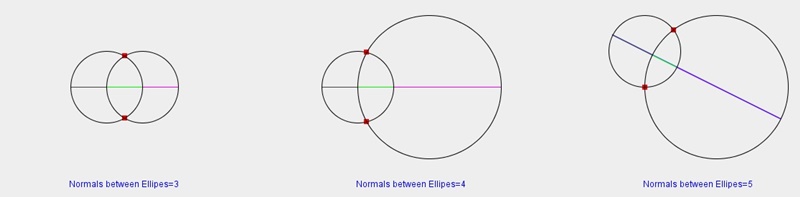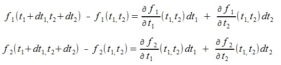 2.2.2 Newton Raphson method and the formulas for Step3returns=>page top Let t1 and t2 be the parameters of C1 and C2 curves and represents these curves by their x, y components as follows: Here, bold types represent vectors. (1)To get a common normal line between two curves, we have to find the t1, t2 which achieve the local minimum of the distance between two curves. The following f1(t1, t2) is the square of the distance bwtween C1 and C2. (2)The following conditon is required to minimize the f1(t1, t2) (<a, b> is inner product of vector a and vector b). (3)Let f1(t1, t2), f2(t1, t2) be the right side of the abve (3) (ignoring coefficient). then, (4)Let dt1, dt2 be very small values or infinitesimals(dt1, dt2 are written as Δt1, Δt2 in a textbook), then the following formulas are derived from the relatons between total differential and partial differential for the f1(t1), t2, f2(t1,t2). (5)Here, the right sides of (5) are represented as follows: (6)The approximation formula of the NewTon-Raphson method is given by setting parts of the left sides of (5) equal 0(zero) as follows. (7)(5) can be written as follows: (8)The matrix representation of (8) is followings: (9)Let D be the matrix of the left side of (9): (10)The dt1, dt2 are given by solving (9) as follows (det means determinant): (11)3. test Resultsreturns=>page top 3.1 Test code: NormalLinesBetweenShapesBasic